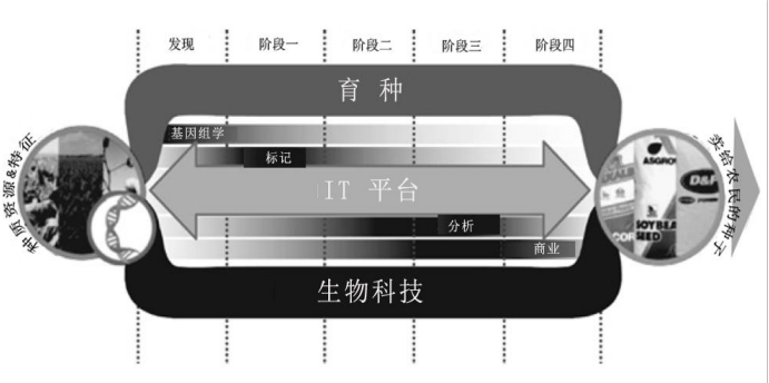 图 4 孟山都研发途径概览 生物科技和育种形成并行研发途径,通过共享工具和技术相联系。IT 平台是支持研究、产品描述和产品改良决策的链接 有助于筛选了解新基因和种质资源的实验室与田间工作在两种途径中融合。信息收集产业规模化,且往往高度自动化。
