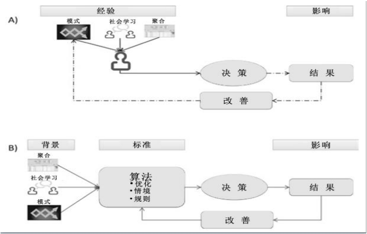 图 6 构建智能 IT 系统 A) 传统上,专家依靠经验做出最优决策,而且他们关于决策规则、标准,和学习的知识还保留个体性。因此建立反馈回路需要很多年,使得知识积累变成一个很慢的过程 B) 通过建立智能 IT 系统,规则和标准能变成共同资产并在此基础上优化提升 明确和抓住决策 开发智能系统的第一步是抓住决策本身。关键是在可重复的、被理解为规则系统和重复应用于相似信息的途径中明确决策。揭示这些规则和标准需要实验目的和研发途径中所起作用的细节知识。 抓住决策背景 智能 IT 系统不能仅仅列举和应用导向决策的一系列规则。它还必须抓住决策背景(暂时相关信息的快照)。抓住背景, 对于了解哪些信息是相关的和如何最优衡量很重要。 信息库存能提供历史背景,它不仅储存决策,还有用于决策时的准确信息。这样用于决策的特殊信息就能被建档,之后可以被用来重建决策过程。随着时间推移,系统记忆的产生能够用于提升和完善未来决策的迭代。 抓住决策结果 智能 IT 系统还必须能评估和学习决策结果: 决策的影响是什么?一个阶段已经进步的产品是否能继续升级?当某种农业操作使用后,这种候选产品真的如预测那样表现更好了吗? 人类至少部分学习了行动结果,智能 IT 系统也应该用相似方式学习。通过抓住结果,决策模型能成为基准并提升,因而能把专家决策变为共同财富,还能再次从下一代科学家的计量、建模和随后提升中学习。